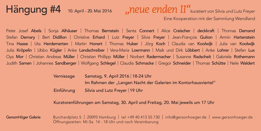 Die Ausstellung trägt den programmatischen Titel neue enden II und verweist auch auf die erste im Sommer 2015 realisierte Ausstellung neue enden im Kasseler Kunstverein, Fridericianum, mit 39 Teilnehmenden.